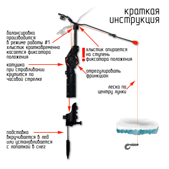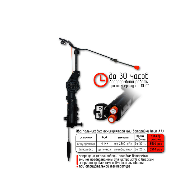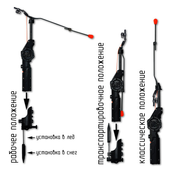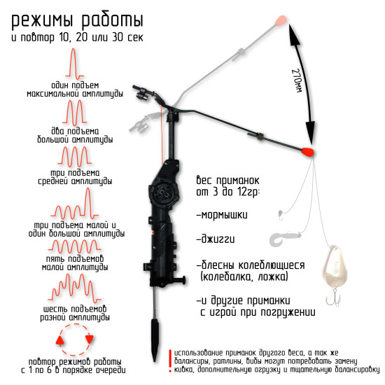Электронная удочка Спутник предназначена для ловли рыбы с помощью придания приманке амплитудных колебательных движений по типу джиггинга, тем самым имитируя движения рыбака. Имеет 5 разных амплитуд и на каждой по 3 промежутка времени через который будет произведёнг повтор режима работы.