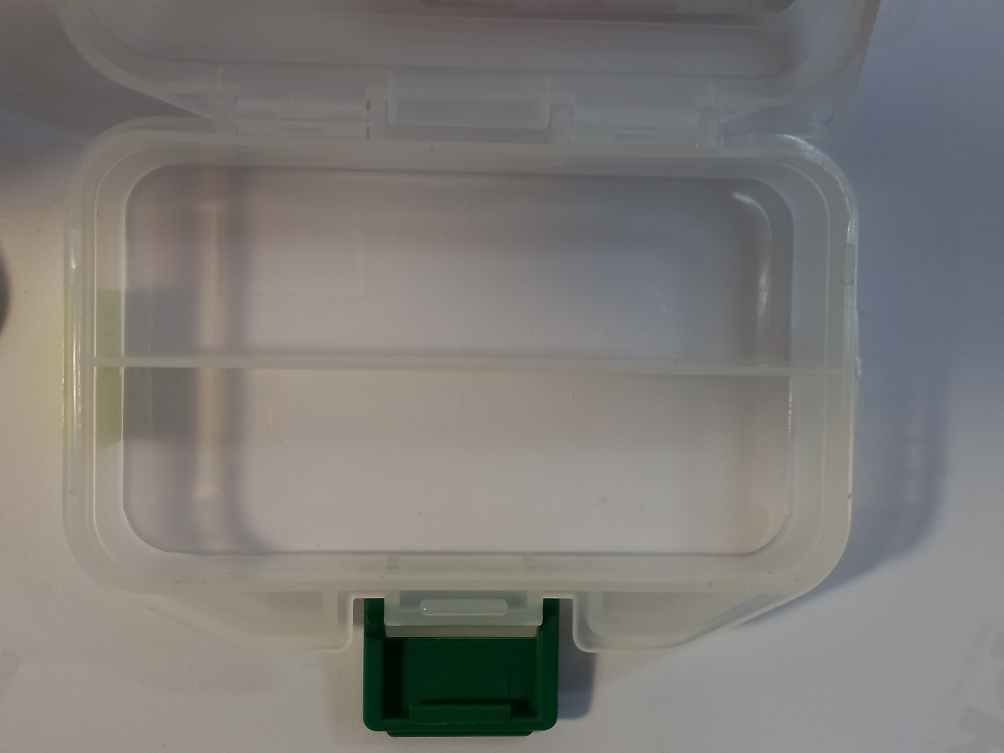 Коробочка двухсекционная под приманки, крепёж, джигголовки, блёсна....Изготовлена из ударопрочной пластмассы, оснащена надежным замком и отверстием под темляк.